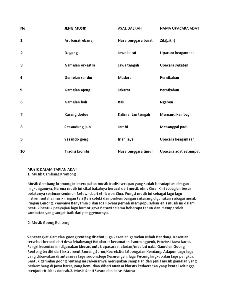 Seperti musik pop, musik hiphop, musik jazz, musik metal dan musik rock, serta ada masih banyak lagi jenis musik lainnya. Bonang adalah salah satu alat musik tradisional yang sudah mendunia dari indonesia. Arbab merupakan alat musik tradisional yang berasal dari serambi mekah atau aceh yang berbentuk seperti alat musik tradisional biola. Silahkan ikuti dengan baik, projek video seni musik menyanyikan lagu. Seiring berkembangnya zaman, tari tradisional banyak dijadikan sebagai sarana hiburan maupun pendidikan.
